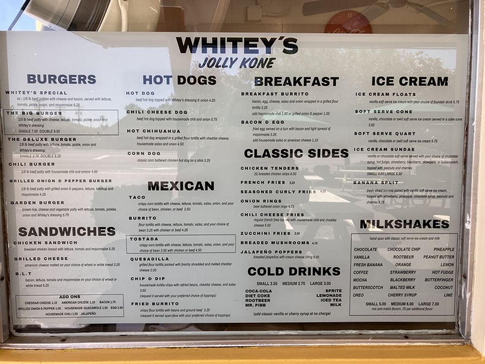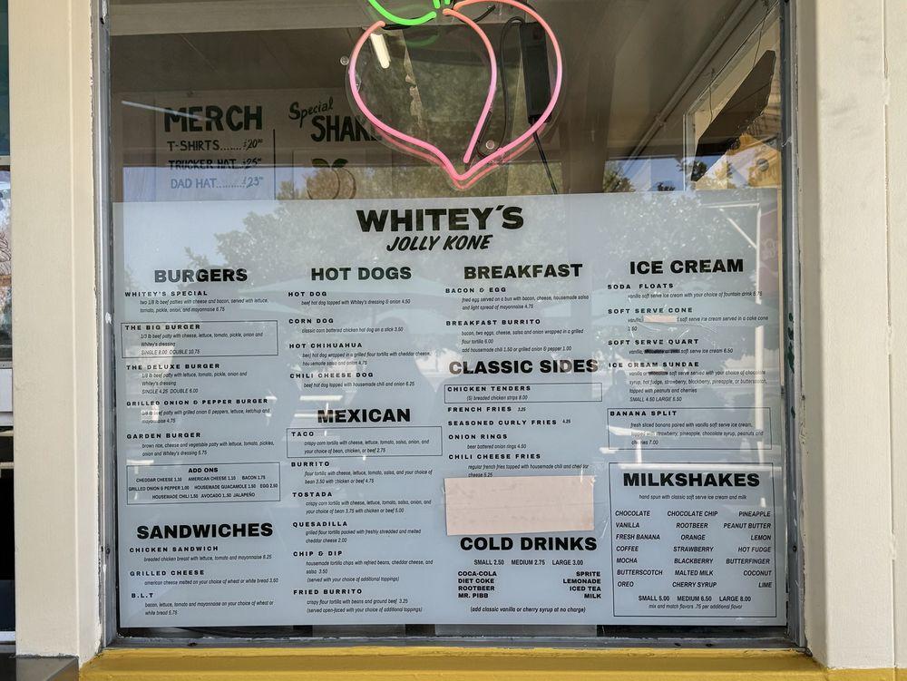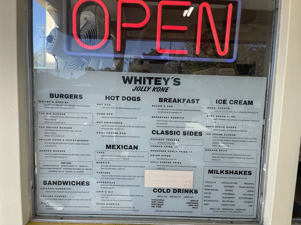 Whitey’s Jolly Kone, located in West Sacramento, CA, is a nostalgic burger stand serving up classic favorites since 1963. Customers rave about the Whitey’s Special, a double patty burger with bacon and cheese on a fresh bun. The menu also includes delicious fries, shakes (especially the peach shake), and coffee Oreo shake. The atmosphere is retro with classic 50s and 60s music playing, adding to the charm. Despite occasional wait times, diners appreciate the affordable prices and ample seating options like picnic tables with umbrellas and misters. The drive-thru, takeout, and delivery services make it convenient for customers to enjoy the tasty offerings of Whitey’s Jolly Kone. If you're in the mood for a quality burger and shake in a nostalgic setting, this local spot is a must-visit.